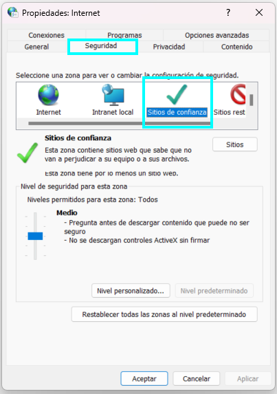 - En el equipo ir a Propiedades de Internet > Seguridad > Sitios de Confianza.